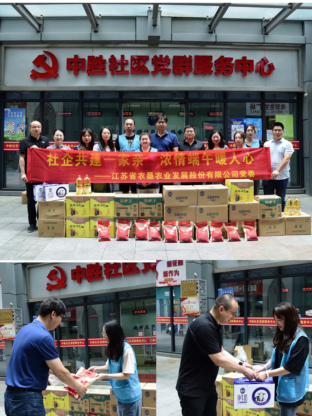 在端午节来临前夕,为弘扬中华传统美德,加大与所辖社区共驻共建力度,营造文明和谐的节日氛围,6月21日,388vip太阳集团官网到建邺区沙洲街道中胜社区开展“社企共建一家亲 浓情端午暖人心”慰问活动,给社区一线网格员们送去慰问品和节日祝福。