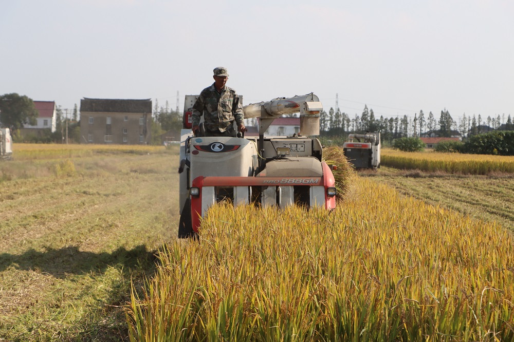 一粒粒饱满的稻谷被收割机收入“囊”中,随后又被装到停在田埂边的运粮车上,一车车满载粮食的卡车开往就近的农事服务中心排队卸粮、烘干、装仓。