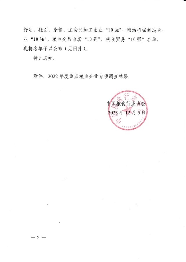 近日,我国2022年度大米、小麦粉、食用油加工企业“50强”名单,菜籽油、棕榈油、花生油、玉米油、稻米油、芝麻油、油茶籽油、葵花籽油、亚麻籽油、挂面、杂粮、主食品加工企业“10强”、粮油机械制造企业“10强”、粮油交易市场“10强”、粮食贸易“10强”名单确定出炉。