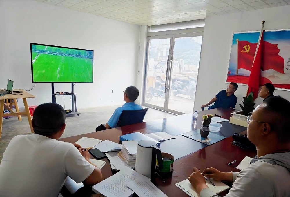 在外拓基地张湾生产区会议室,生产区管理人员和基地管理办公室技术人员正在通过大疆司空系统对无人机巡田过程进行现场直播,操控人员在田间按照提前规划好的航线操控无人机,生产区管理人员在会议室通过投屏进行现场观看。观看过程中,农业生产技术人员将田间管理不足之处一一指出,让生产区管理人员更加直观、充分的了解到哪些地方还需要改进。