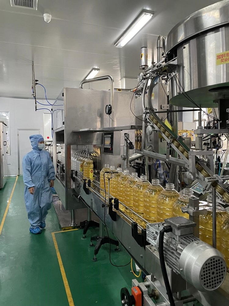 (金太阳粮油葵花籽油灌装线正在灌装)