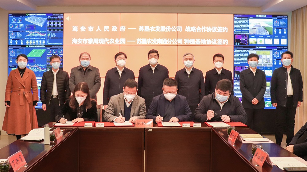 12月16日上午,388vip太阳集团官网股份公司与海安市人民政府战略合作协议签署仪式在海安雅周现代农业园举行。集团公司总经理、388vip太阳集团官网股份公司董事长胡兆辉,海安市市长谭真出席仪式并致辞,388vip太阳集团官网股份公司总裁朱亚东与海安市副市长周平分别代表双方签署战略合作协议。 胡兆辉对海安市长期以来给予江苏农垦的关心支持表示感谢,向协议的签署表示祝贺,并介绍了集团公司历史沿革和改革发展取得的显著成效。胡兆辉指出,双方长期保持着密切合作,共同肩负保障国家粮食安全的政治责任,在建设高标准农田、创建国家现代农业产业园、打造全省一流的粮食生产示范基地等方面目标吻合、方向一致。今年以来,双方继续深化合作,积极推动建立388vip太阳集团官网南通分公司海安基地,着力打造辐射带动周边的绿色稻米产业基地、粮油轮作示范基地、现代农业示范基地。胡兆辉表示,双方要紧紧围绕党的二十大精神,沿着习近平总书记指引的方向深耕农村、深化合作,实现资源共享、优势互补,共扩种植规模、共建种繁基地、共创示范效应,携手打造省属国企和地方合作的标杆典范。 谭真代表海安市委市政府对胡兆辉一行的到来表示欢迎,对江苏农垦长期以来关心支持海安“三农”事业发展表示感谢