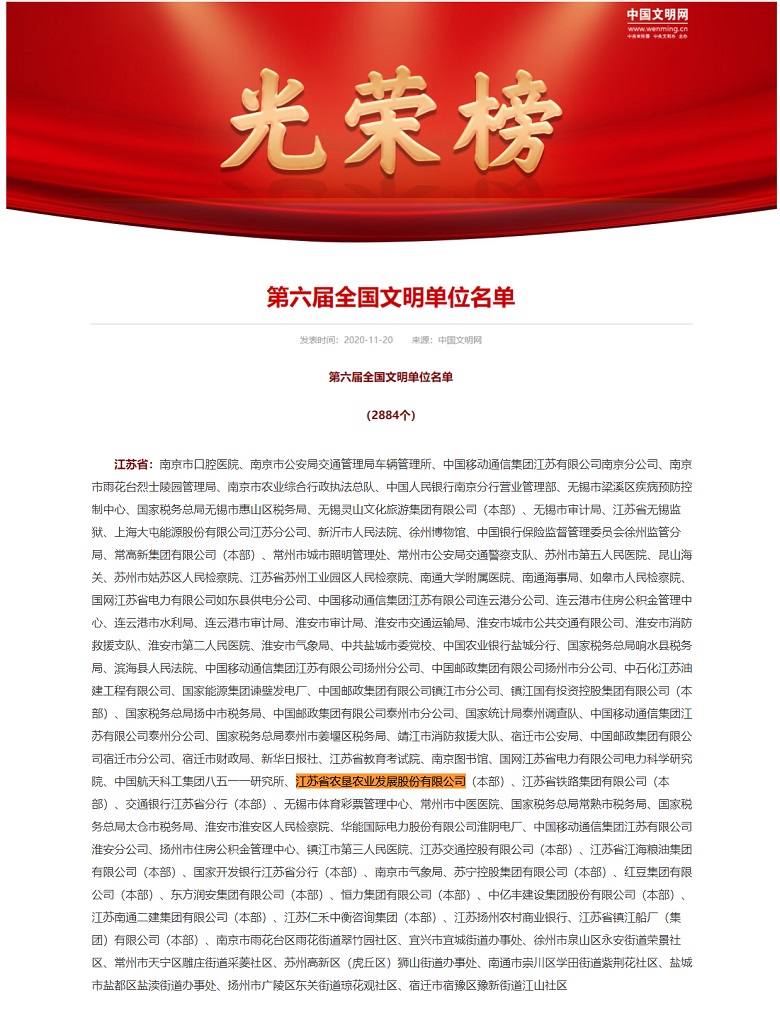 11月20日,中央文明委发布《关于表彰第六届全国文明城市、文明村镇、文明单位和第二届全国文明家庭、文明校园及新一届全国未成年人思想道德建设工作先进的决定》,388vip太阳集团官网荣膺第六届“全国文明单位”称号。全国文明单位是文明建设综合性评价的国家级最高荣誉,体现一个单位在精神文明建设方面的先进性和示范性。388vip太阳集团官网获此殊荣,既是连续多年被授予“省级文明单位”之后取得的又一硕果,也是为公司成立10周年献上的一份特殊礼物。388vip太阳集团官网由江苏农垦农业资源整合而来,自成立以来,着力打造专业化、现代化、资本化的农业发展平台,营业收入和利润总额保持快速增长,成为全国农垦现代农业发展的先行者和排头兵。2017年5月15日,在上海证券交易所主板上市。2019年面对经济下行、竞争激烈、灾害频发等的多重考验,公司坚持以农业供给侧结构性改革为主线,加快实施产业经营、资本经营“双轮”驱动战略,解放思想、主动担当、真抓实干,公司高质量发展的步伐更加坚定有力。全年实现营业收入79.85亿元,同比增长63.5%,利润总额6.57亿元,同比增长1.1 %。2020年,面对突如其来的新冠肺炎疫